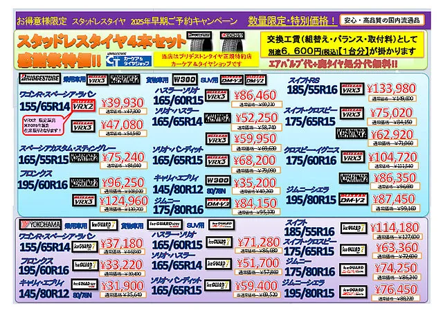 スタッドレスタイヤ購入しないと、、、今年はそろそろ買い替え時期かも、、、という方はとてもお得な内容になってます!