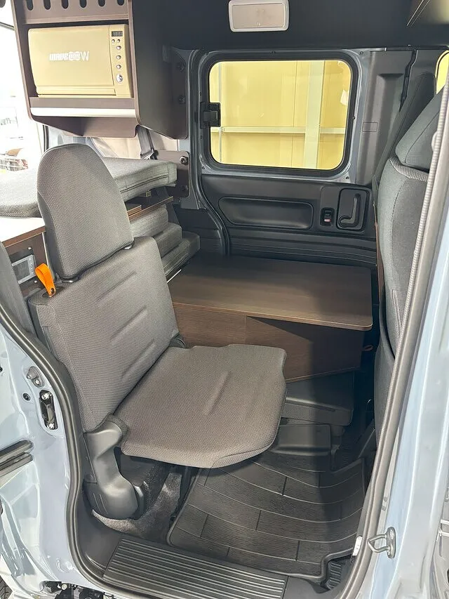 キャンピングといえばやはり大事な快適性! 運転席のシートは回転が可能になっているなど多彩なシートアレンジができ、日常使いはもちろん、寝るときのフラットさもバッチリ。