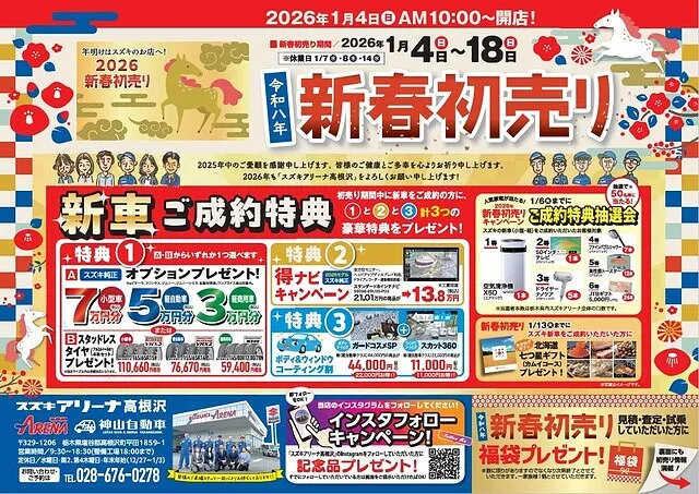 初売り期間中に新車ご成約で①・②・③の計3つの豪華特典をプレゼント!